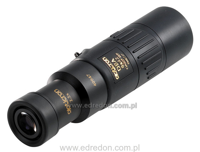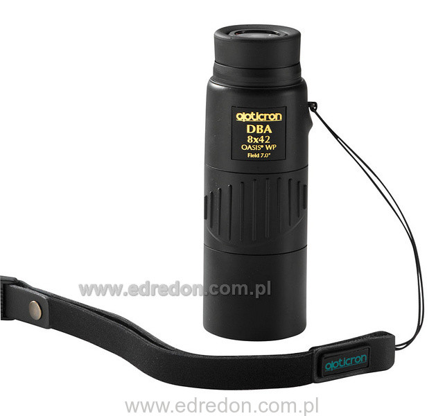 Monokular DBA Oasis ma konstrukcję optyczną profesjonalnej lornetki, ale jest wykonany w sposób ułatwiający prowadzenie obserwacji jednym okiem. DBA ma szerokie i precyzyjne pokrętło regulacji ostrości, specjalne mocowanie paska oraz wykręcaną, sztywną muszlę oczna blokowaną w 3 pozycjach. Na pryzmatach zastosowano unikatowe 64-warstwowe powłoki odbijające OASIS®, które zmniejszają do jedynie 1% straty światła podczas przechodzenia przez dachowe pryzmaty. Te powłoki są o wiele skuteczniejsze od powszechnie używanego srebrnego powlekania. Wszystkie soczewki mają specjalne wielowarstwowe powłoki przeciwodblaskowe (S-Coat) na wszystkich granicach powietrze-szkło. Obie te technologie zapewniają, że straty światła podczas przechodzenia przez cały system optyczny są ograniczone do minimum i nie przekraczają łącznie 5%, a obraz jest klarowny i kontrastowy niezależnie od warunków oświetlenia. Monokular jest w pełni wodoodporny do głębokości 5 metrów, a obudowa pokryta jest wysokiej jakości gumą. Ten monokular można przekształcić w kieszonkową lunetę łącząc z konwerterem 2,5x oraz z uchwytem do zamontowania na statywie. Dane techniczne: